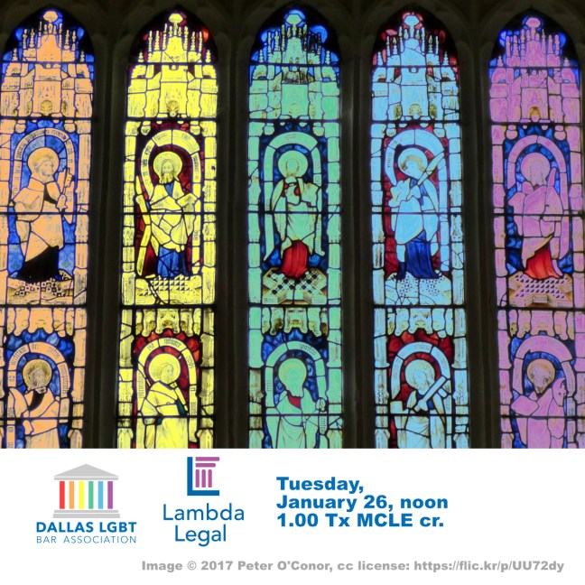 Lambda Legal and Dallas LGBT+ Bar Association are excited to present “LGBTQ+ Civil Rights in the Era of Religious Liberties,” a CLE at noon on January 26, 2021, approved for 1.00 hour of MCLE credit in Texas. The class is free to attend, but you must register in advance.
