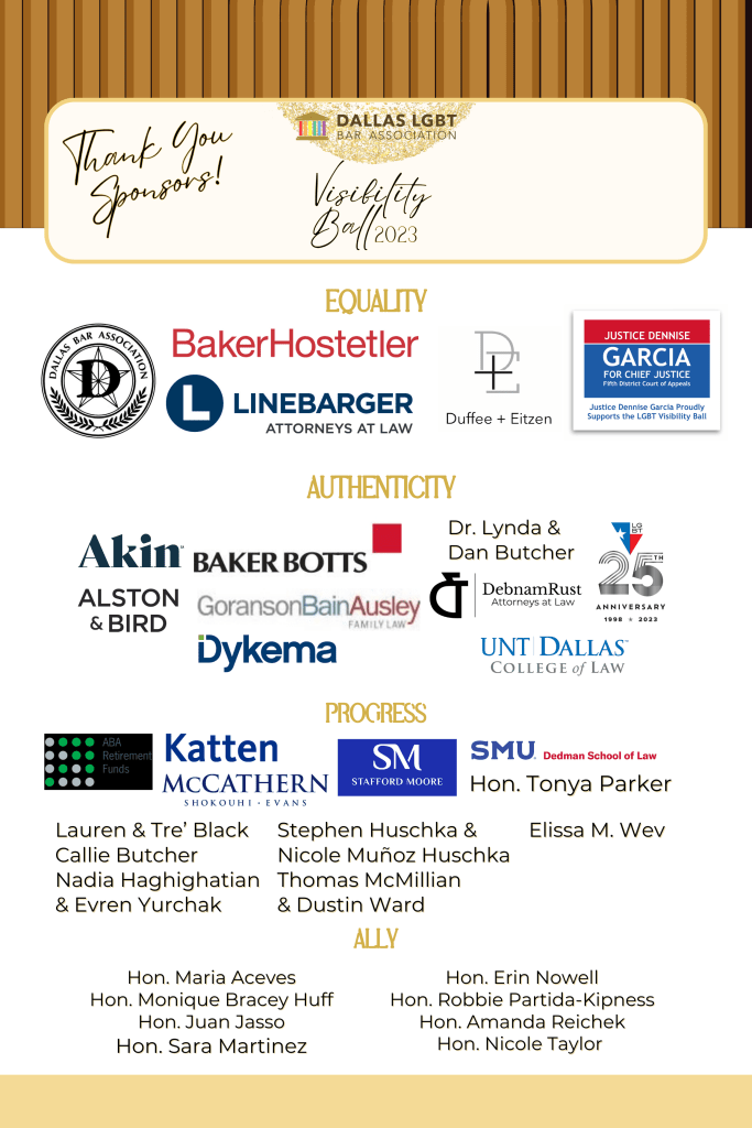 In addition to a celebration of our community within the practice of law, Visibility Ball also serves as our largest fundraiser to support the programming we do throughout the year. To pledge your sponsorship for Visibility Ball 2024, please contact us at info@dallaslgbtbar.org. The 2023 Sponsorship Packet can be reviewed here: our 2023 Visibility Ball Sponsorship Packet.
