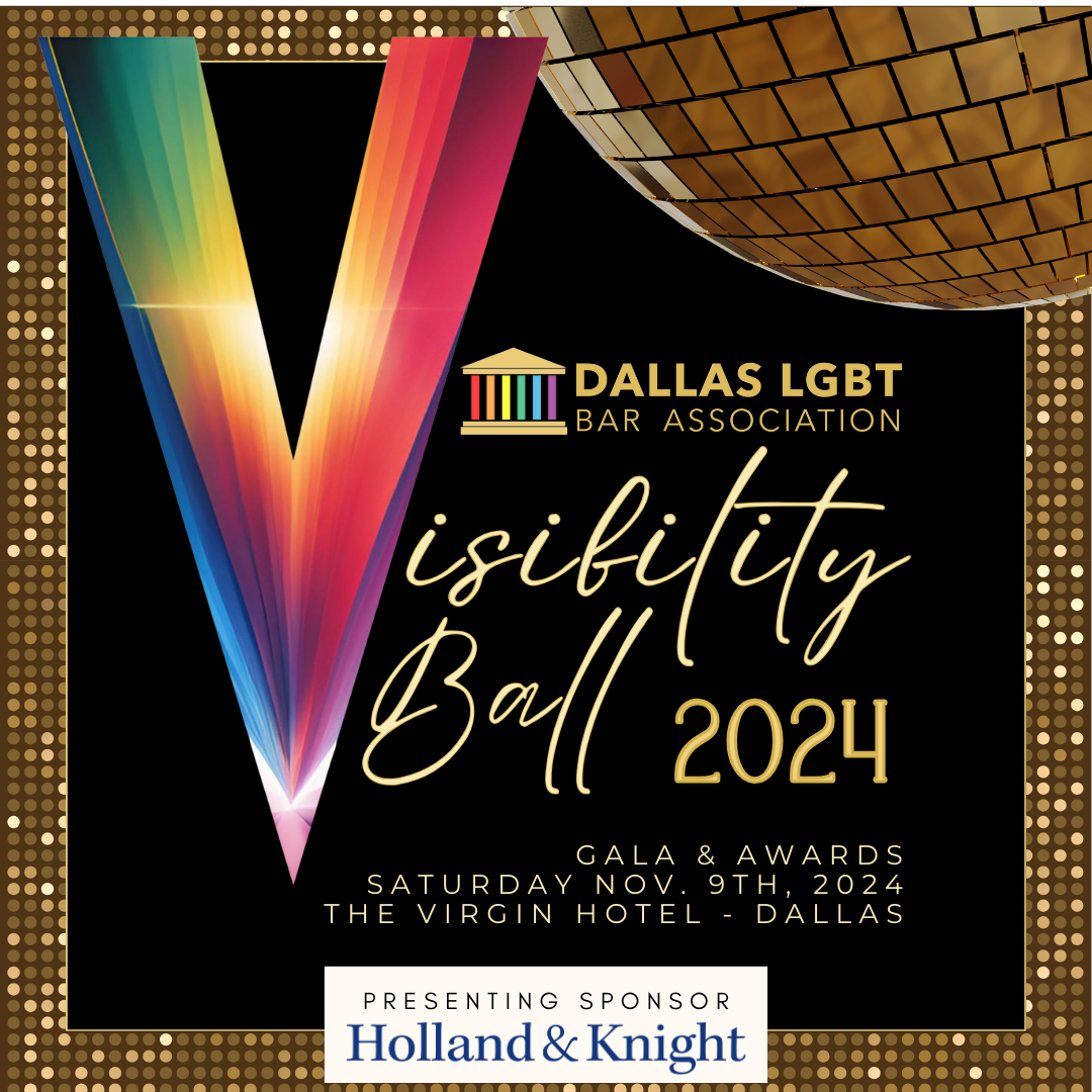 Join The Dallas LGBT Bar Association for our Third Annual Visibility Ball on Saturday, November 9th from 7pm to 10pm at The Virgin Hotel as we honor our 2024 Justice Award and scholarship recipients. Guests are invited to a cocktail reception, seated dinner and award presentation.