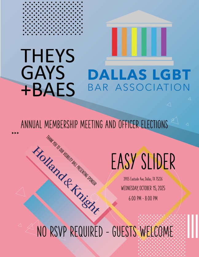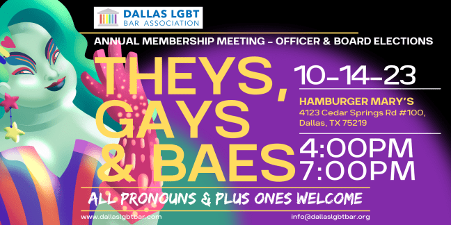Theys, Gays, & Baes - all pronouns and plus ones welcome The Annual Member Meeting brings together our Dallas LGBT+ Bar Assoc. community to take care of some business, share space with colleagues and supporters, and gear up for the opportunities and challenges ahead. We will be voting on the following Officer and Board positions … Continue reading Theys, Gays, + Baes: Annual Member Meeting, Sat. Oct. 14th 4pm – 6pm @ Hamburger Mary’s