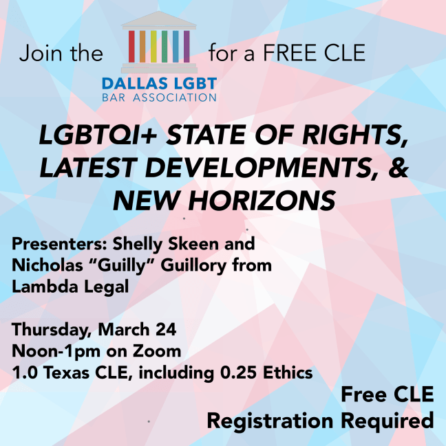 The Dallas LGBT Bar Association is celebrating Pride 2022 with an evening social at Sue Ellen’s on June 23. Join us to mix, mingle, and GET PROUD! Law students and Allies are encouraged to attend. REGISTER HERE This event is Free for Dallas LGBT Bar Members; $20 for non-members. Join or renew your membership here. Date … Continue reading Pride Happy Hour: Let’s Get Proud